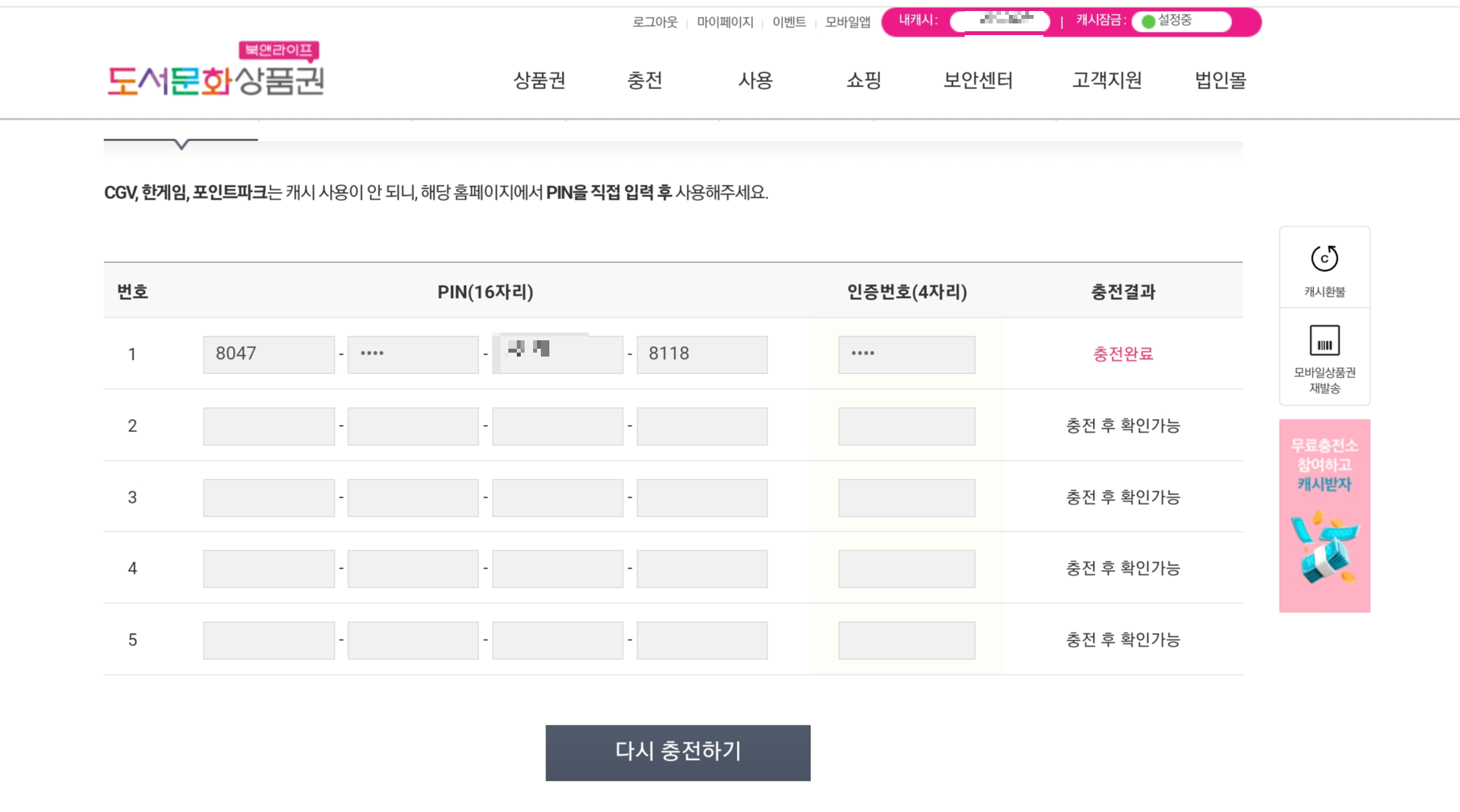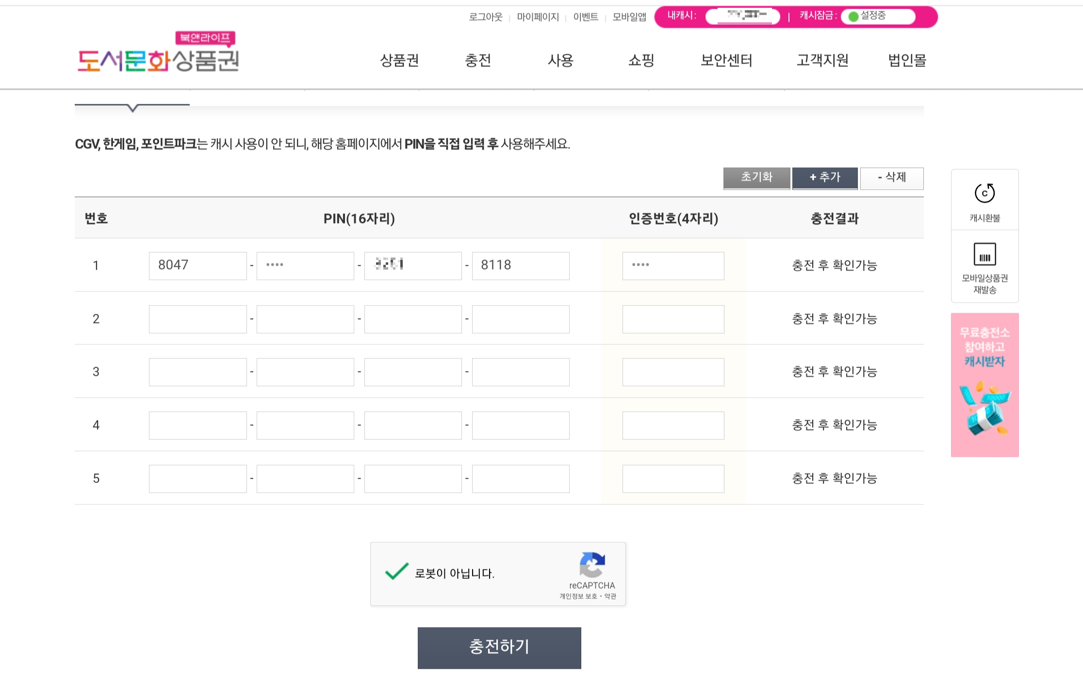 5. 인터넷에 PIN번호 16자리와 인증번호 4자리 입력 및 충전하기 버튼 클릭
