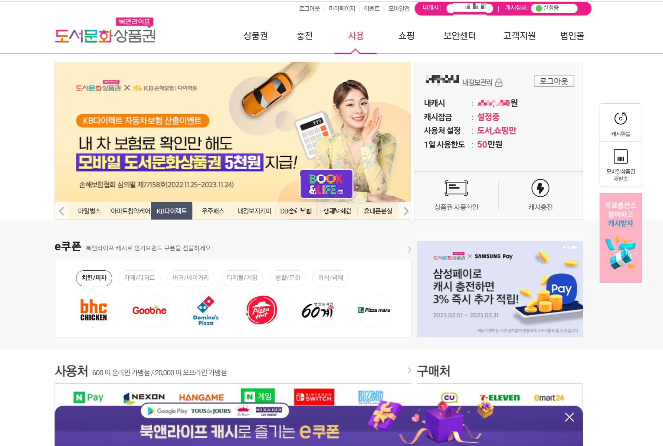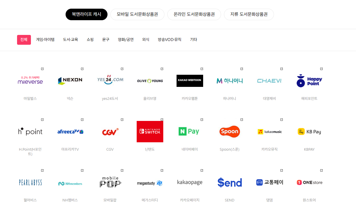 북앤라이프 캐시, 상품권(모바일,온라인,지류)으로 사용할 수 있는 사용처